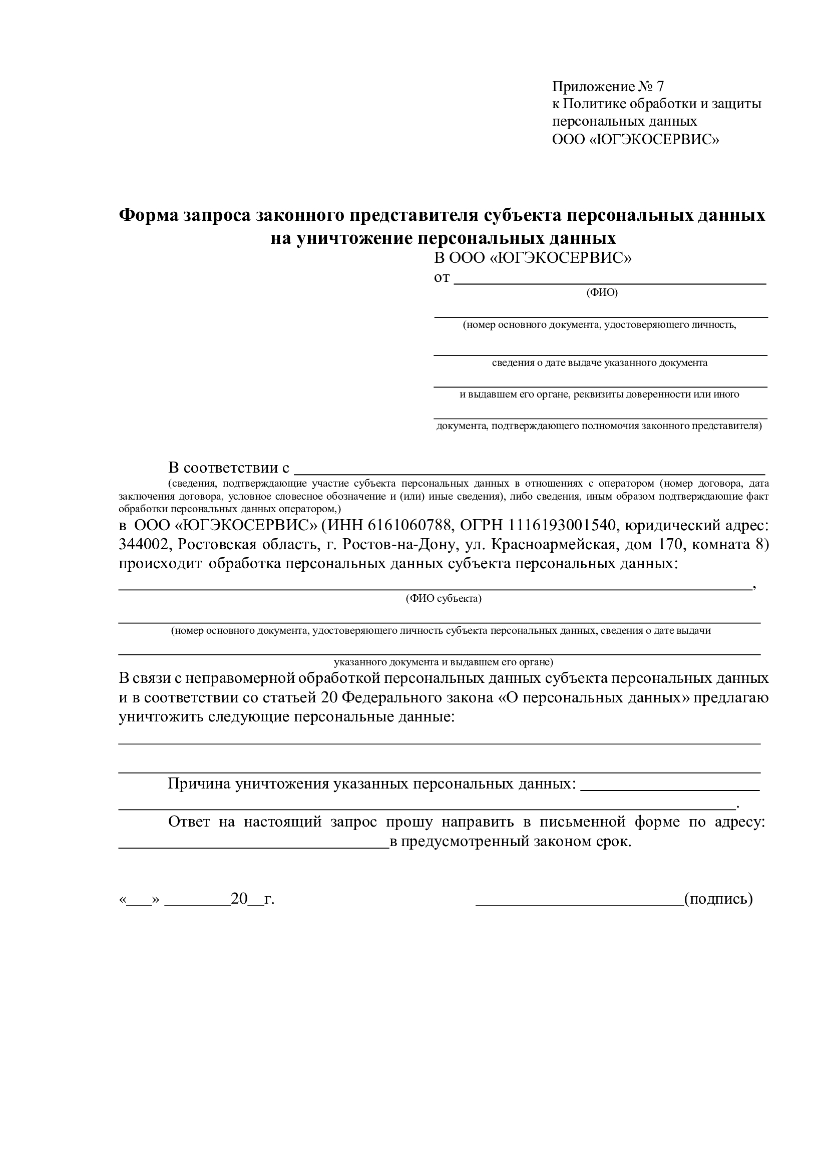 1.4.5. Субъект персональных данных имеет право обжаловать действия либо бездействие Общества, обратившись в уполномоченный орган по защите прав субъектов персональных данных (территориальное подразделение Роскомнадзора).